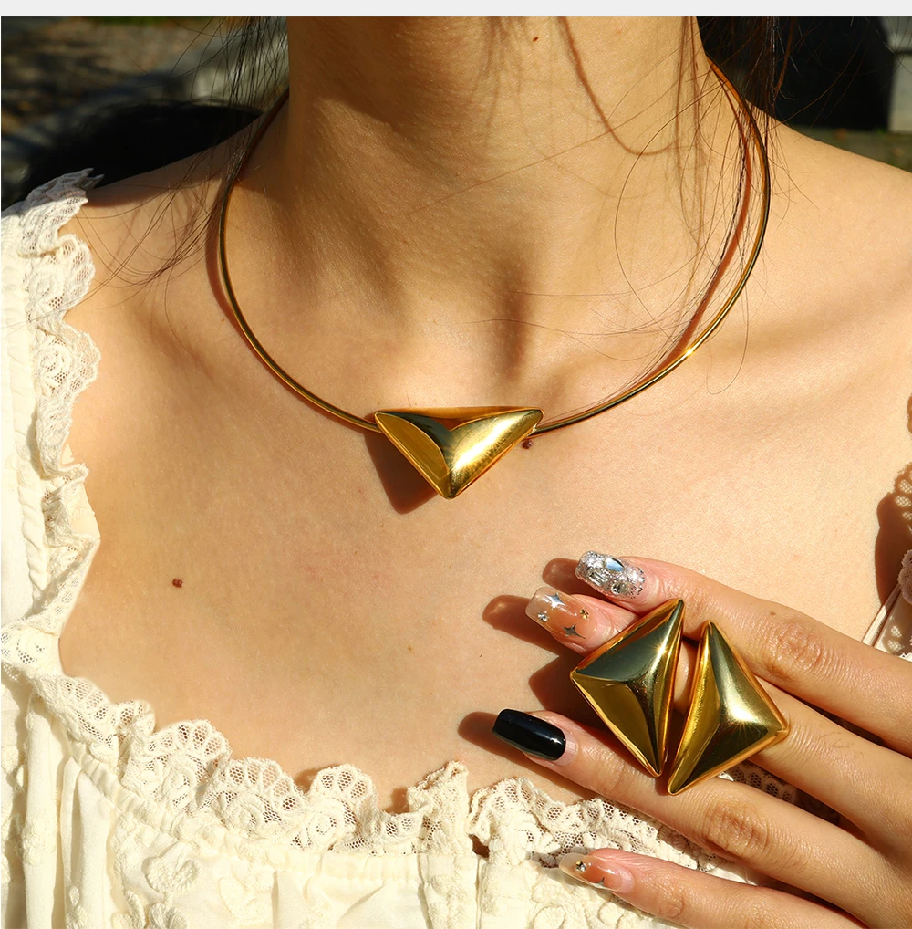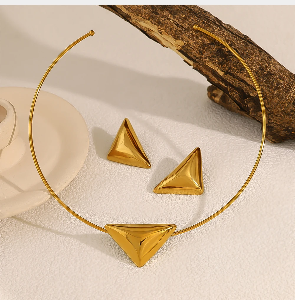 Elevate your look with the Eclipse Triangle Jewelry Set, a modern blend of geometric artistry and sleek sophistication. Crafted from high-quality 316L stainless steel, this set includes a striking pair of stud earrings and a matching choker necklace, both designed to bring a bold yet minimal statement to any outfit. The polished triangle motifs catch the light beautifully, offering a contemporary edge that suits both casual and dressy occasions.
